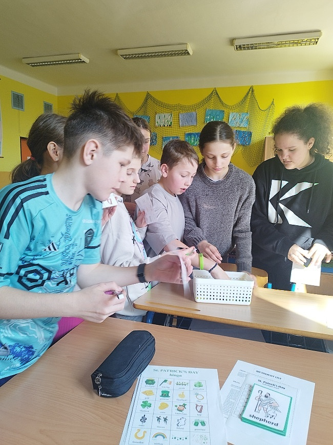 Žáci se seznámili se základní slovní zásobou tematicky spojenou s tímto svátkem. Nová slovíčka si osvojovali hravou formou pomocí flashcards a zábavné „scavenger hunt“, při které je hledali po třídě a po škole. Následně si vše procvičili na pracovních listech. Velký úspěch mělo také bingo, které žáky bavilo a zároveň upevnilo jejich znalosti. Nechyběla ani kreativní část – děti si vyrobily magický trojlístek pro štěstí. Také si vyzkoušeli vyluštit šifru od leprechauna, což byla skvělá výzva pro jejich logické myšlení.